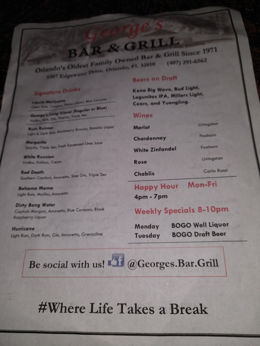 Welcome to George’s Hideaway, a vibrant bar situated at 5507 Edgewater Dr, Orlando, FL. This hidden gem provides an inviting atmosphere with plenty of seating, both indoor and outdoor, perfect for hanging out with friends. The spacious T-shaped bar adds to its charm, alongside the six pool tables and dartboards, ensuring endless fun for patrons.